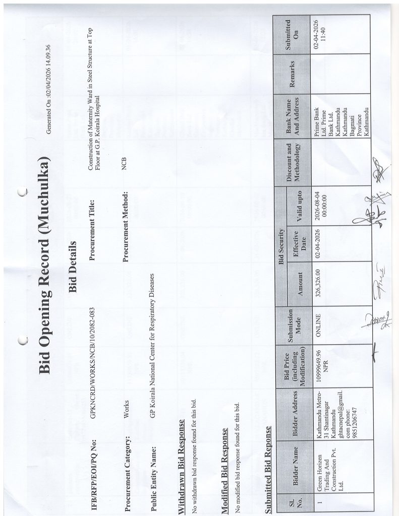 Invitation for Bids of Construction of Maternity Ward in Steel Structure at the Top Floor at G.P Koirala Hospital